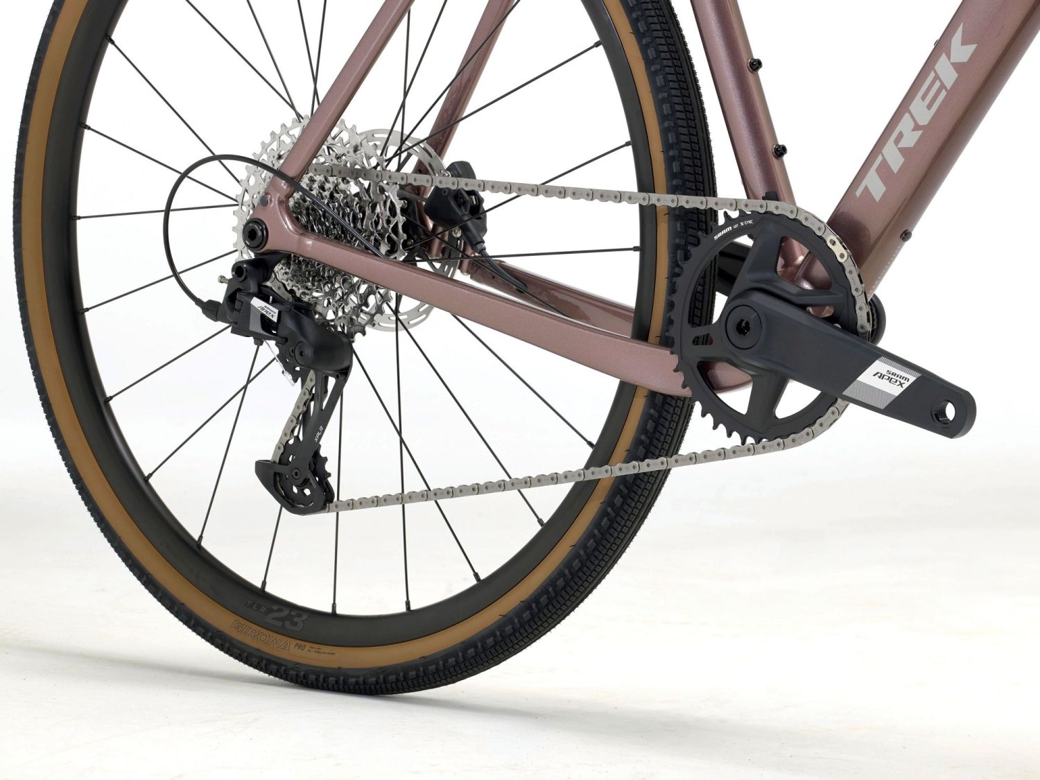 Um quadro em Alumínio Alpha Série 300 com garfo totalmente em carbono e espaço para pneus de até 50mm. Transmissão atualizada SRAM Apex XPLR de 12 velocidades, rodas Bontrager Paradigm com pneus Bontrager Girona Pro Tubeless Ready, além de suportes para instalação de bolsas, bagageiros e equipamentos.