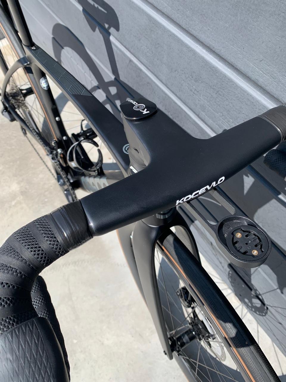 - Cockpit: Guidão Integrado Carbono Kocevlo (400mm x 100mm) – Cabeamento interno e estética clean.