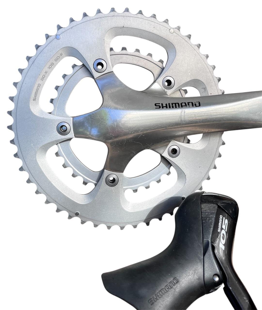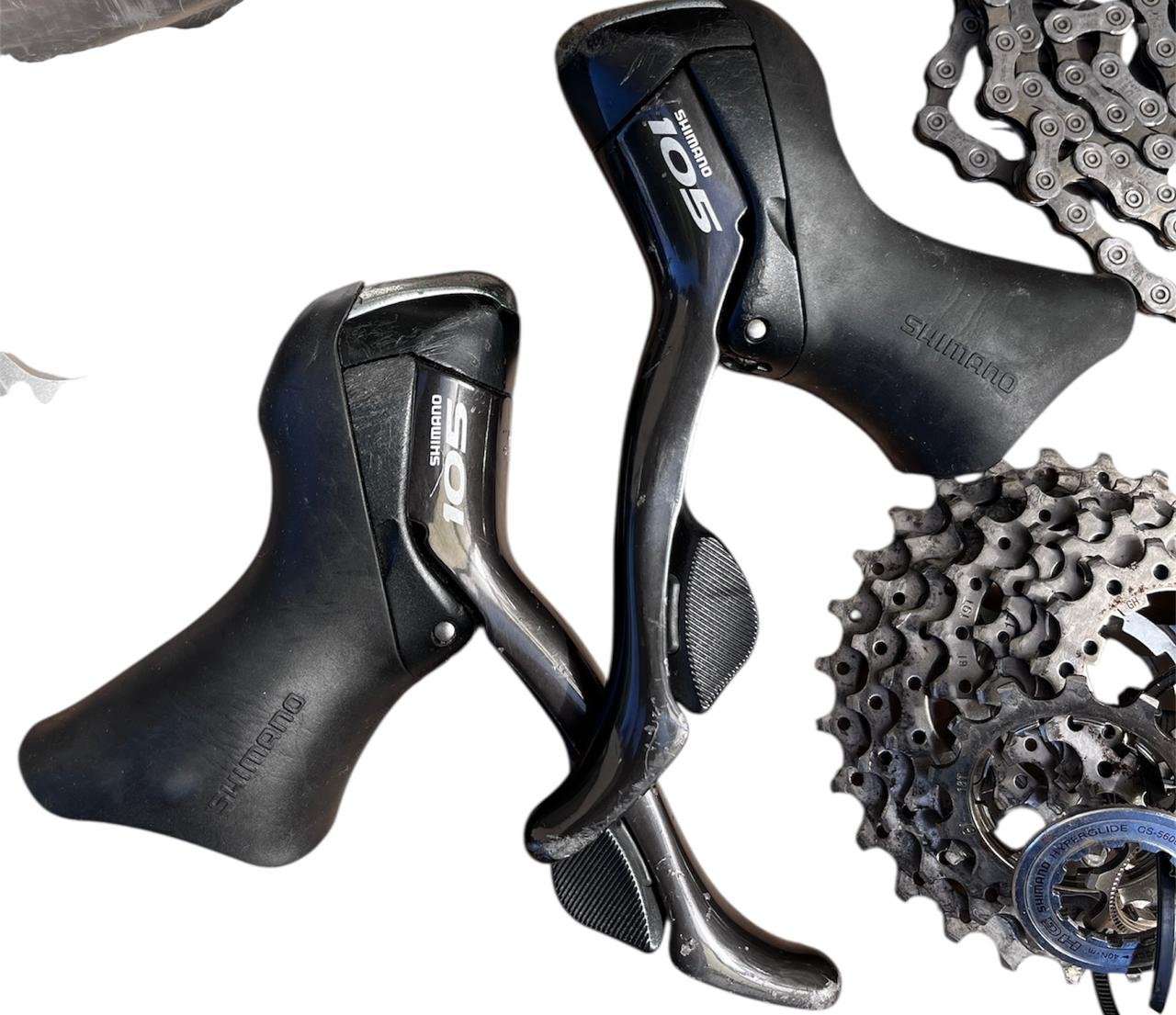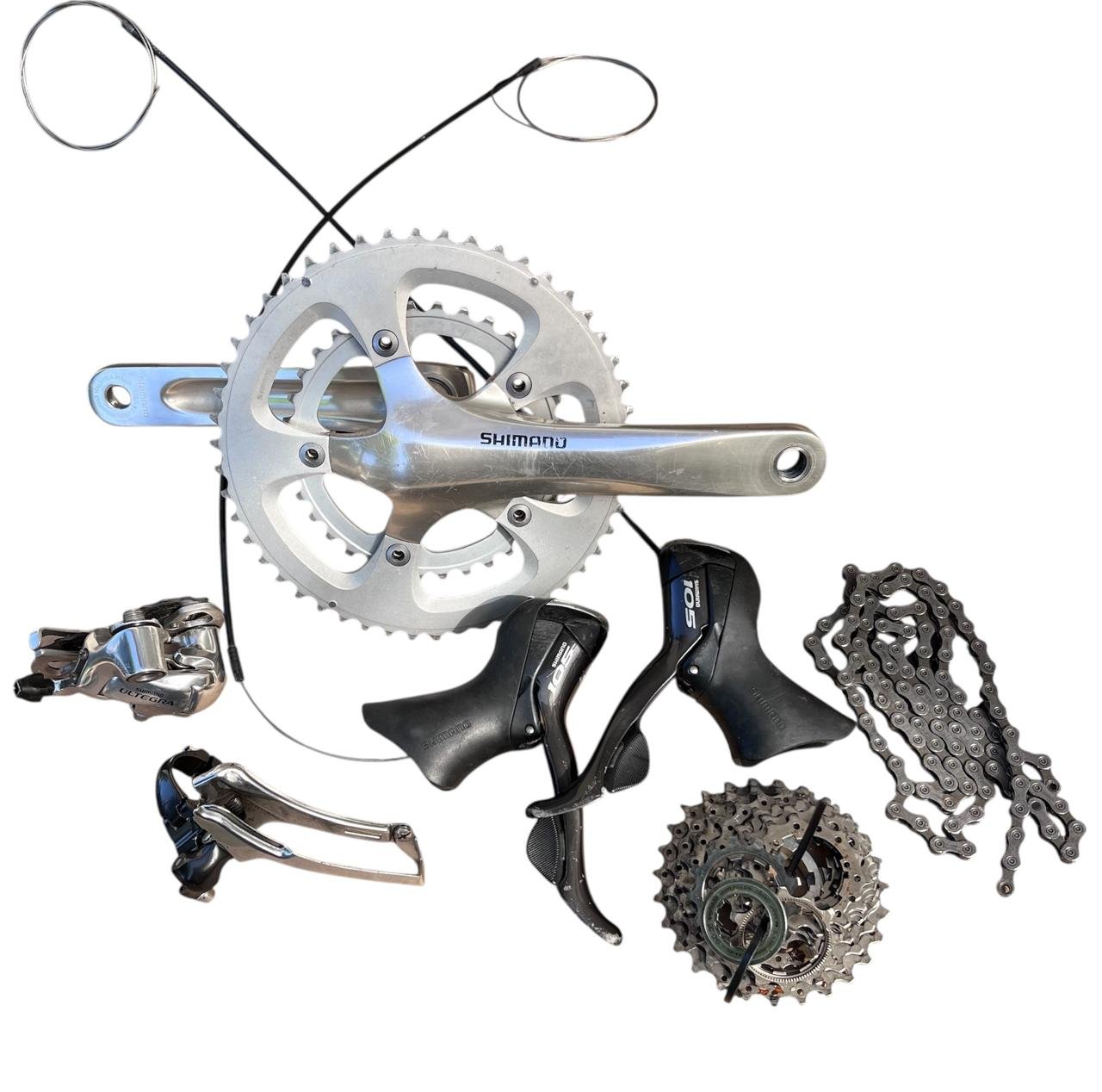 Grupo de peças Shimano para montar uma bicicleta de estrada de 20 velocidades. Detalhes: -PEDIVELA SG-X 105 50X34 175MM FC-R600 -TROCADORES 105 -CÂMBIO TRASEIRO ULTEGRA CURTO -CASSETE 105 12X27