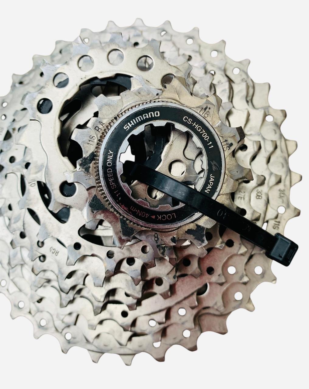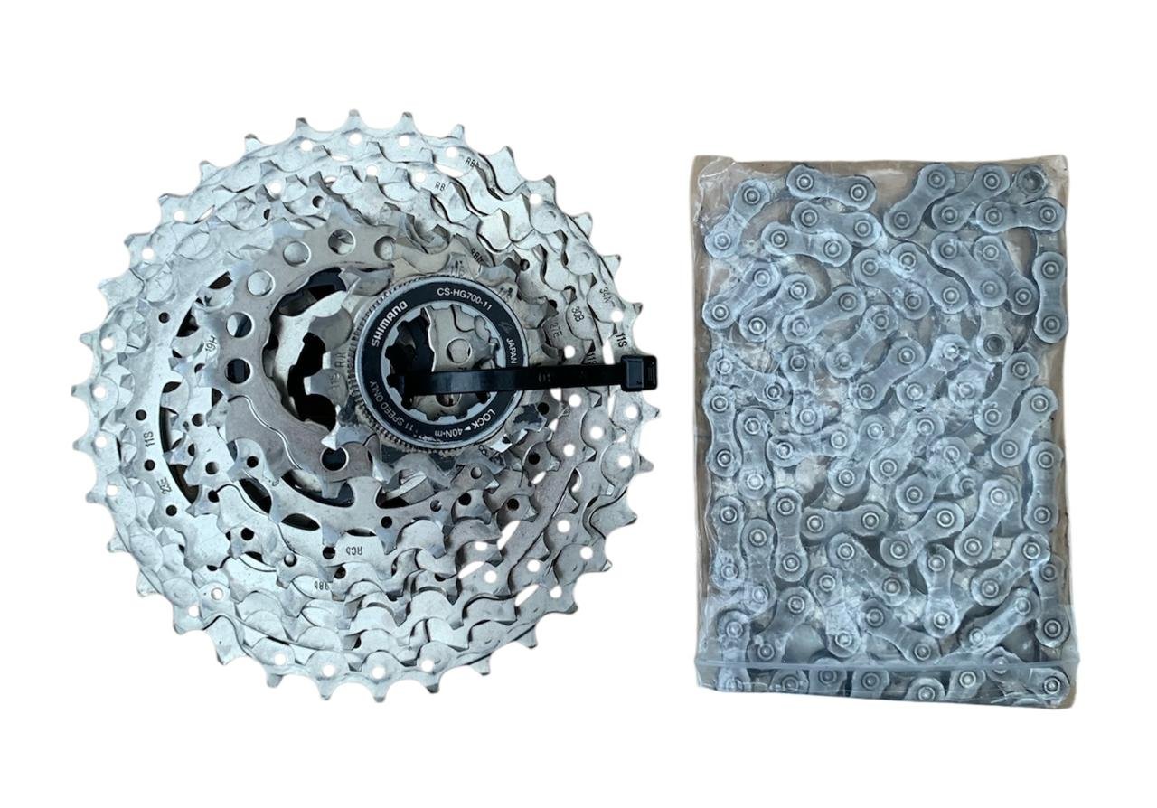 Cassete: Shimano HG700-11 (Escalonamento 11-34T). Um dos mais versáteis da linha, compatível tanto com cubos de 10v quanto de 11v (acompanha o espaçador necessário).Corrente: 11 velocidades inclusa(Shimano HG 601), com desgaste controlado e compatibilidade total com o cassete.Aplicação: Ideal para quem busca conforto em subidas sem perder velocidade final no plano.